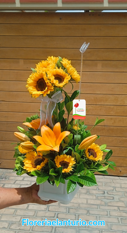 08 Girasoles, 02 liliums naranjas, fino follaje verde, base de cerámica blanca. Tamaño aproximado: 60 cm. de alto por 35 cm. de ancho.