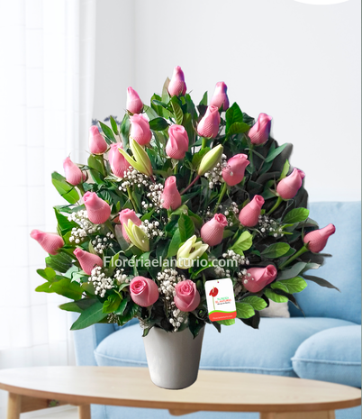 24 rosas rodadas, fino follaje verde, lazo decorativo en base de cerámica blanca. Tamaño aproximado: 65 cm. de alto por 45 cm. de ancho.