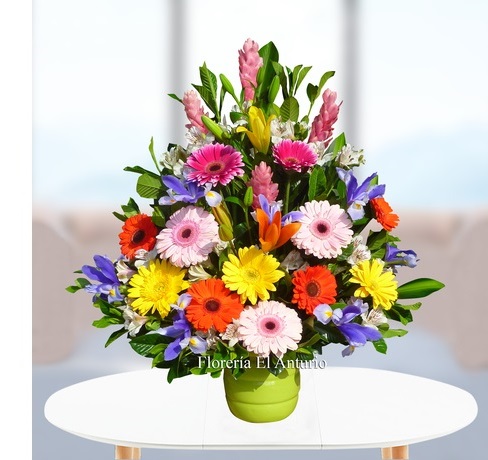 12 gerberas de colores, ginger rosado, iris, liliums naranja y amarillo, astromelias, fino follaje verde en base de cerámica blanca. Tamaño aproximado: 65 cm. de alto por 45 cm. de ancho.