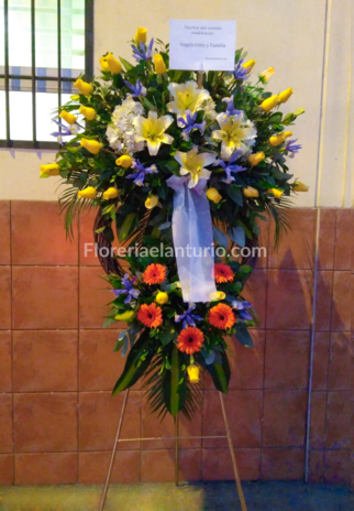 Corona floral de mimbre con 24 rosas amarillas, liliums amarillos, hortensias verdes, gerberas naranjas, iris, fino follaje verde, lazo decorativo, pedestal de fierro. Dimensiones aprox. : 2 m. de alto por 90 cm. de ancho