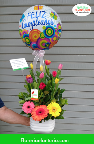 10 tulipanes de colores, 03 gerberas de colores, fino follaje verde, 01 globo de cumpleaños en base de cerámica blanca. Tamaño aproximado: 50 cm de alto (sin globo)