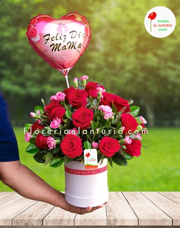 Arreglo floral en box con 22 rosas rojas, clavelitos rosados, fino follaje verde, 01 globo N° 09.