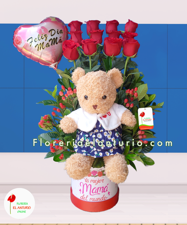 Arreglo floral en box con 12 rosas rojas, fino follaje verde, 01 peluche de 30 cm. de alto, 01 globo N° 09.