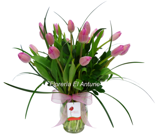 Arreglo floral con 20 tulipanes, lazo decorativo, base de vidrio. Dimensiones aproximadas: 50 cm. de alto por 30 cm. de ancho.